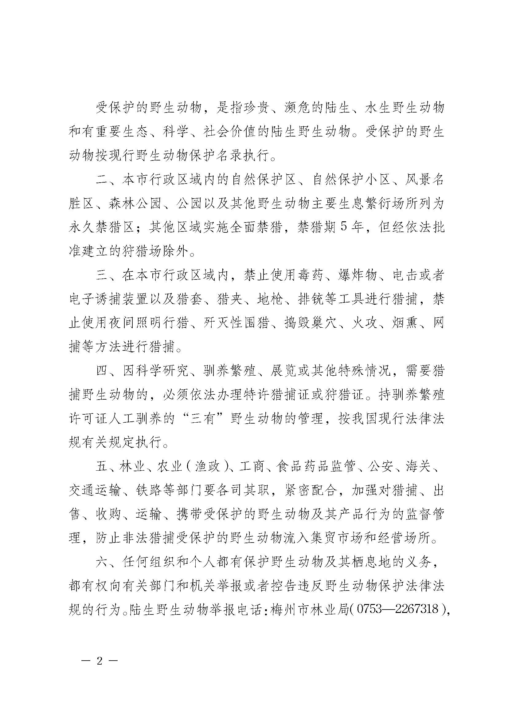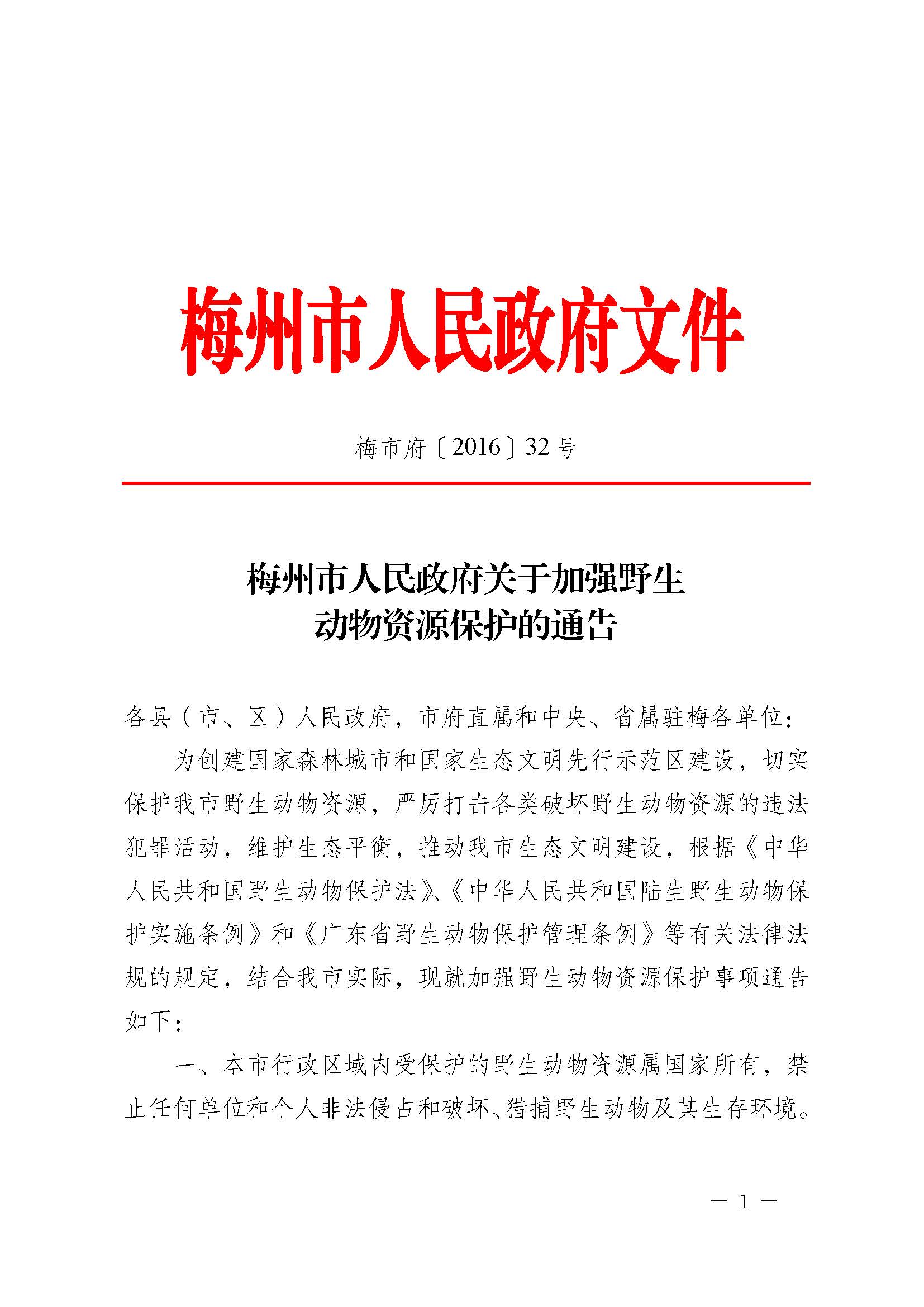 梅州市人民政府關(guān)于加強(qiáng)野生動(dòng)物資源保護(hù)的通告