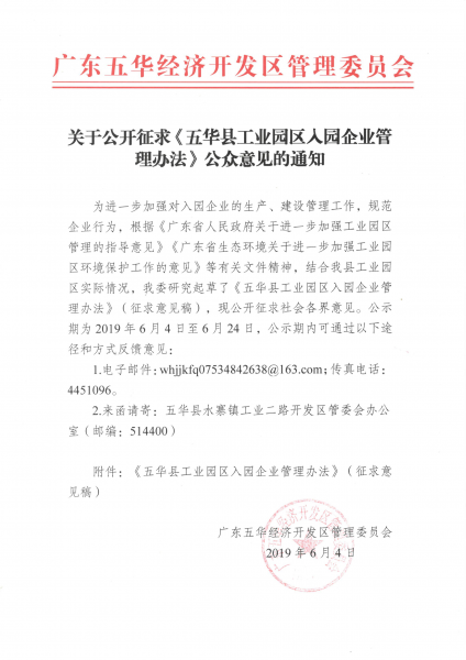 關(guān)于公開征求《五華縣工業(yè)園區(qū)入園企業(yè)管理辦法》公眾意見的通知