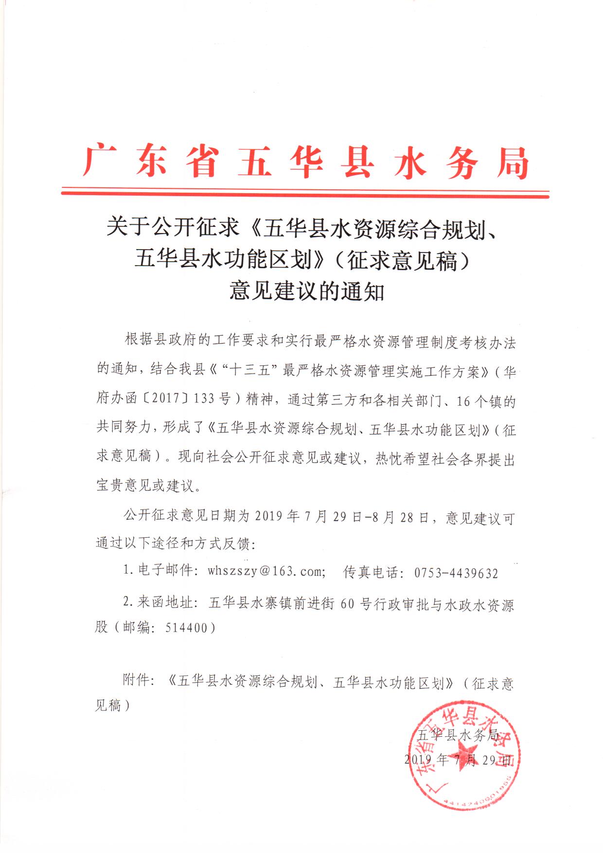 五華縣水務(wù)局關(guān)于公開征求《五華縣水資源綜合規(guī)劃、五華縣水功能區(qū)劃(征求意見稿)》意見建議的通知