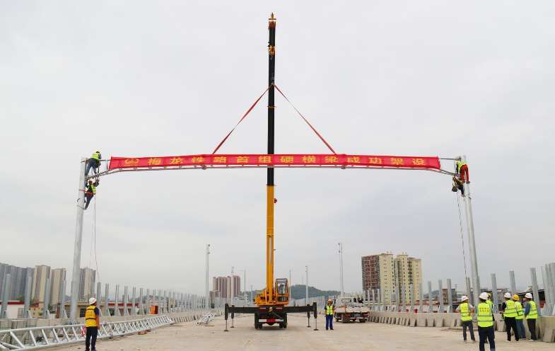 據(jù)悉,梅龍高鐵全線共設(shè)置硬橫梁25組,為保障首組硬橫梁順利架設(shè),施工單位根據(jù)前期現(xiàn)場勘查定測數(shù)據(jù),研究制定施工方案,同時對施工作業(yè)人員進(jìn)行高空作業(yè)安全培訓(xùn)和技術(shù)交底。施工過程中,作業(yè)人員規(guī)范操作,順利完成了起吊、對位、連接、緊固、落臂等工序,成功將長達(dá)21米的硬橫梁安裝固定在支柱上。