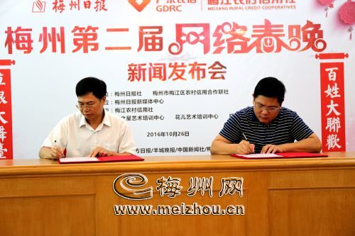 梅州日報社總經(jīng)理羅金良和梅州市梅江區(qū)農(nóng)村信用合作聯(lián)社理事長林光平共同簽署網(wǎng)絡(luò)春晚戰(zhàn)略合作協(xié)議