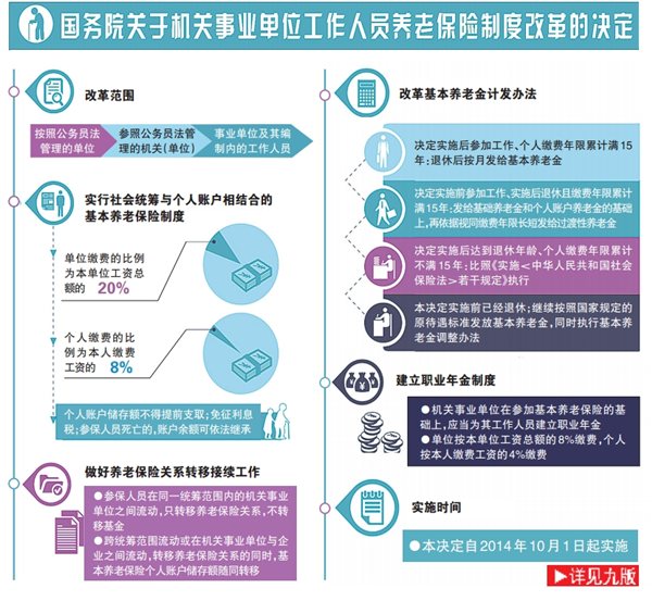 近日,國務院印發(fā)《關于機關事業(yè)單位工作人員養(yǎng)老保險制度改革的決定》,決定從2014年10月1日起對機關事業(yè)單位工作人員養(yǎng)老保險制度進行改革;同時決定,統(tǒng)一提高全國城鄉(xiāng)居民基本養(yǎng)老保險基礎養(yǎng)老金最低標準,再次提高全國企業(yè)退休人員基本養(yǎng)老金標準。