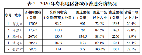 普通國省道網(wǎng)絡(luò)結(jié)構(gòu)不斷優(yōu)化?!笆濉睍r期,全市累計投入約123億元,完成普通國省道新改建和路面改造里程約1000公里,完成國、省道規(guī)劃調(diào)整,全市國省道總里程由1591公里增加至3084公里。全市普通國道二級以上公路的比重達到88.6%,普通省道二級以上公路的比重達到49.9%,干線公路服務(wù)能力較大提升。完善國省干線服務(wù)功能,先后建設(shè)國省干線服務(wù)設(shè)施39個,促進地方旅游和社會經(jīng)濟發(fā)展。順利通過“十三五”迎國評驗收。梅州市公路網(wǎng)密度在粵北地區(qū)排名第一,國省道二級以上比重處于中上水平,省道三級以上公路占比83.25%排名第二,具體指標詳見表2。