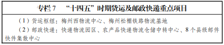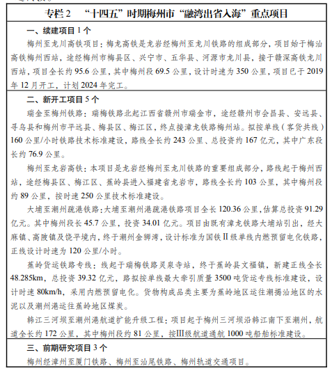 “十四五”期間梅州市綜合交通項目估算完成總投資約960億元,主要包括鐵路、高速公路、航道、國省干線公路、縣鄉(xiāng)公路、重要經(jīng)濟公路、機場、公交工程、公路客貨運樞紐及物流園工程等項目,具體詳見下表。