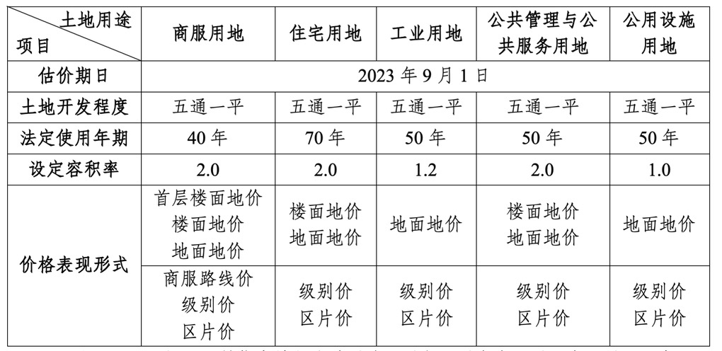 本次基準地價是指熟地條件下的地價,即指在設定容積率、法定最高使用年期,設定土地開發(fā)程度條件下,分用途的土地使用權價格。具體內涵如下: