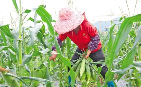 工人們在玉米地里穿梭采摘。(圖片來源:梅州日報 丘林強 攝)