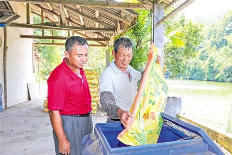 “產(chǎn)業(yè)村長(zhǎng)”張偉君(左)和員工在給魚喂食。(圖片來源:梅州日?qǐng)?bào) 吳騰江 攝)