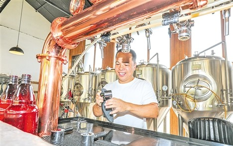 “產(chǎn)業(yè)村長(zhǎng)”梁志龍?jiān)诰起^里用山泉水釀造啤酒。(圖片來源:梅州日?qǐng)?bào) 吳騰江 攝)