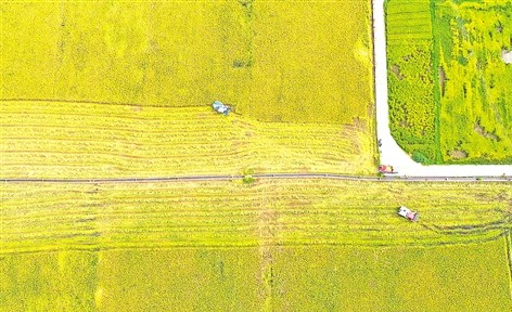 夏收時節(jié),湖柏村稻田里滿是金黃。(圖片來源:梅州日報 高訊 攝)