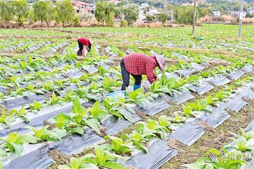 村民在煙田對(duì)煙葉進(jìn)行培土、修剪。(鐘小豐 攝)