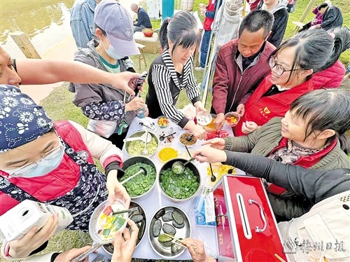 在青食制作體驗區(qū),各村婦女現(xiàn)場教授艾粄、艾葉丸等傳統(tǒng)美食制作技藝。南臺村村民藍女士創(chuàng)新研發(fā)的艾香筍菇青團粄備受好評?!拔覀冞x用新鮮春筍和蘑菇,用艾葉汁做成粄皮,食材新鮮?!彼{女士說,該產(chǎn)品一經(jīng)推出就十分受歡迎。