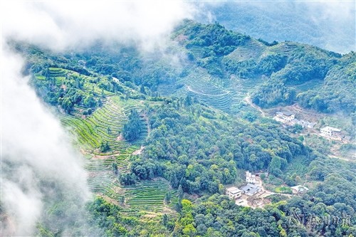 梅江區(qū)清涼山上云霧繚繞,茶園生機(jī)勃勃,一壟壟茶樹(shù)新芽吐綠。(高訊 攝)