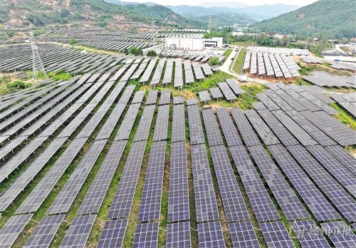 廣東能源梅州平遠(yuǎn)光伏復(fù)合項(xiàng)目(一區(qū)),一排排光伏板隨著山勢(shì)整齊鋪開。(高訊 攝)
