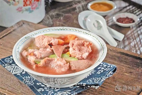 蕉嶺人的一天,是從一碗鮮甜的三及第湯開始的,而外地人對蕉嶺的向往,也離不開那碗僅在蕉嶺才有的味道。三及第以瘦肉、豬肝、豬粉腸為主料,搭配各式蔬菜烹制而成,湯中加入紅曲,形成了獨(dú)具特色的紅湯頭。