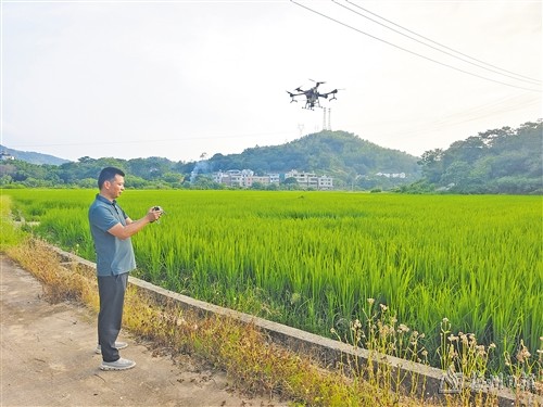 張浩蕩用無(wú)人機(jī)噴灑有機(jī)肥,為農(nóng)作物的茁壯成長(zhǎng)"保駕護(hù)航"。