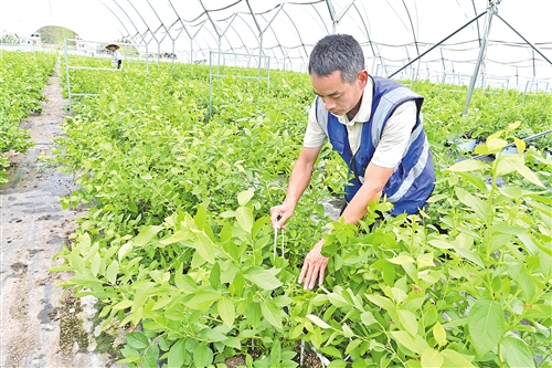 王浩宏正仔細(xì)檢查滴灌系統(tǒng),確保每一株藍(lán)莓都能獲得精準(zhǔn)的滋養(yǎng)。