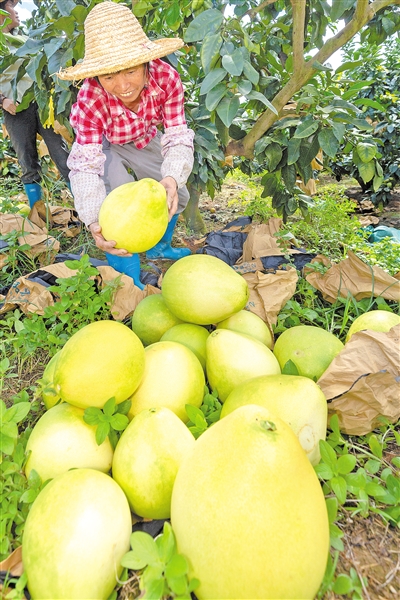 大埔縣西河鎮(zhèn)彰北村的村民正在采摘蜜柚。(連志城 攝 圖片來源:梅州日報)