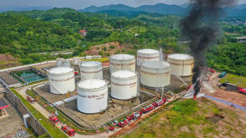此次演練由市政府主辦,梅江區(qū)政府、市應(yīng)急管理局、市消防支隊等單位承辦。演練假定中村油庫原油罐區(qū)一油罐在管道檢修作業(yè)時出現(xiàn)操作失誤,導(dǎo)致油罐發(fā)生爆炸燃燒。事故發(fā)生后,油庫立即啟動自救機制并上報警情。梅州市消防支隊指揮中心接警后,調(diào)動周邊8個大隊、10個中隊參與救援;市政府啟動《梅州市生產(chǎn)安全事故應(yīng)急預(yù)案》,公安、供電、宣傳等單位出動參與救援。演練模擬災(zāi)害發(fā)生、救援隊伍集結(jié)、實施搶險救援等流程,設(shè)置了流淌火蔓延、泄漏燃燒、直升機救援等各類科目,充分檢驗應(yīng)急救援隊伍跨區(qū)域協(xié)同作戰(zhàn)能力、應(yīng)急處置反應(yīng)能力和企業(yè)發(fā)生事故后開展自保、自救能力。