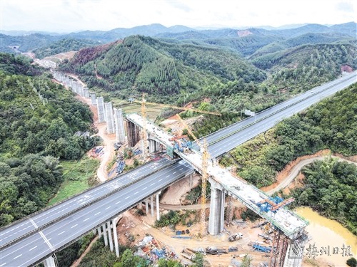 陳屋連續(xù)梁順利跨過濟(jì)廣高速公路,是梅龍高鐵三標(biāo)段橋梁下部結(jié)構(gòu)最后一個(gè)特殊孔跨工點(diǎn)。(圖片來源:梅州日報(bào) 董萌 攝)