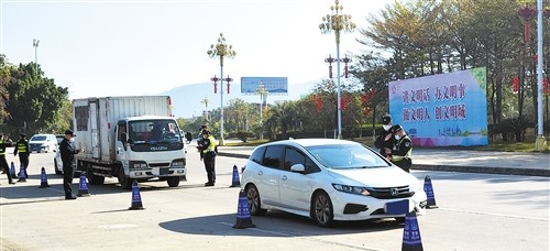 春運(yùn)首日,執(zhí)勤民警對(duì)過往車輛進(jìn)行檢查。(來源:梅州日?qǐng)?bào) 陳堅(jiān)平 攝)
