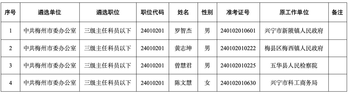根據(jù)《公務(wù)員公開(kāi)遴選辦法》有關(guān)規(guī)定及《梅州市市直機(jī)關(guān)204年公開(kāi)遴選公務(wù)員公告》,經(jīng)過(guò)報(bào)名、筆試、資格審核、面試、考察等程序,經(jīng)市委辦公室室務(wù)會(huì)會(huì)議研究,確定羅智杰、黃志坤、曾慧君、陳文慧同志為市委辦公室擬遴選人員,現(xiàn)予以公示。公示時(shí)間:2025年2月19日至2月25日(5個(gè)工作日)。公示期間,歡迎群眾來(lái)電、來(lái)信、來(lái)訪反映情況。