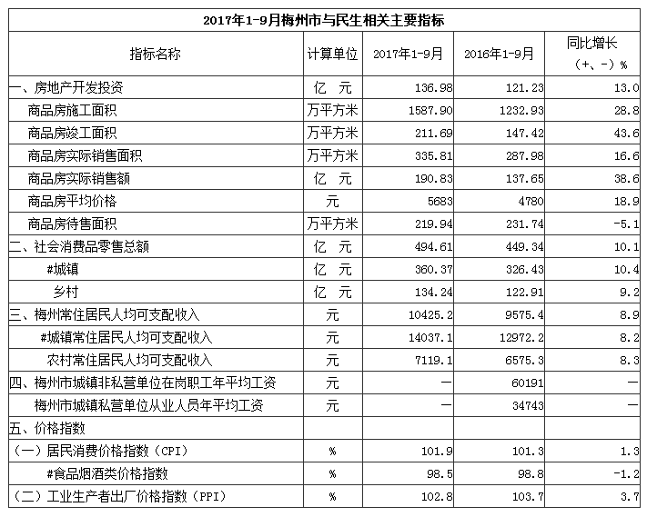 2017年1-9月梅州市與民生相關(guān)主要指標(biāo)