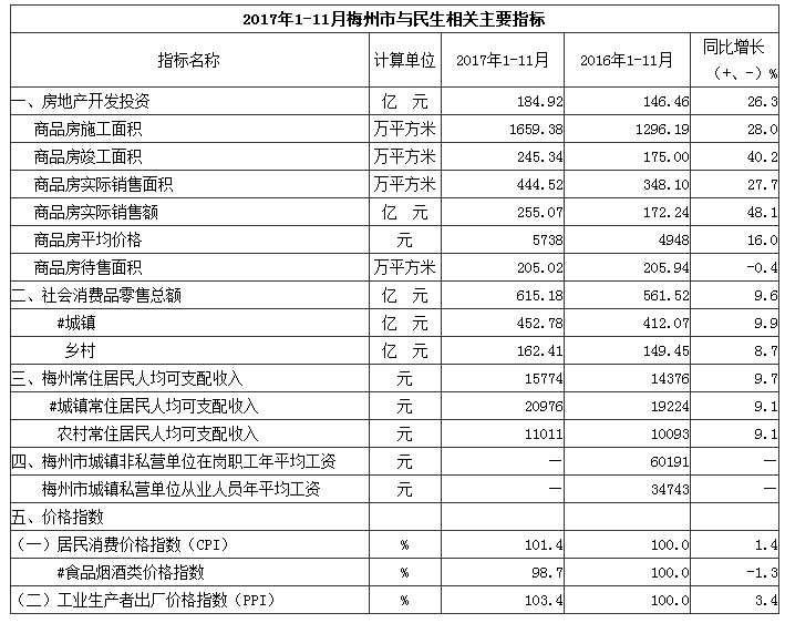 2017年1-11月梅州市與民生相關(guān)主要指標(biāo)