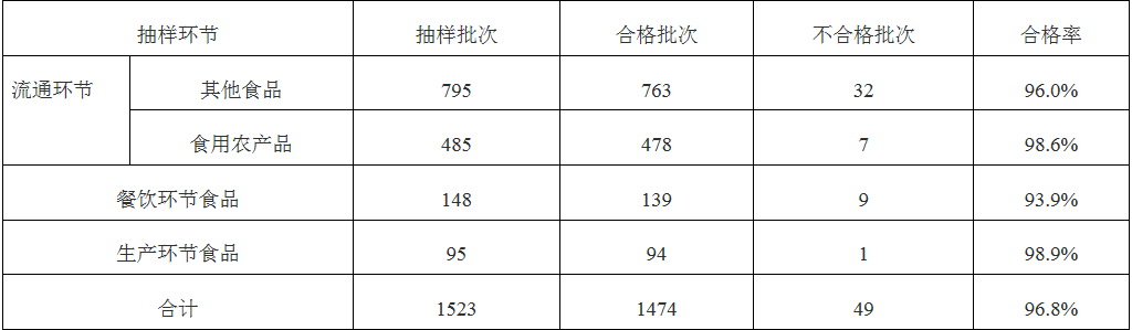為提升我縣食品安全質(zhì)量,保障廣大群眾飲食安全,截止至5月31日,我局組織第三方檢測公司對全縣范圍內(nèi)的消費市場共進行了1523批次的食品監(jiān)督抽檢。監(jiān)督抽檢結(jié)果情況為:合格1474批次,合格率為96.8%;不合格49批次,不合格率為3.2%。具體抽樣環(huán)節(jié)情況如下表(監(jiān)督抽檢明細(xì)見附件):