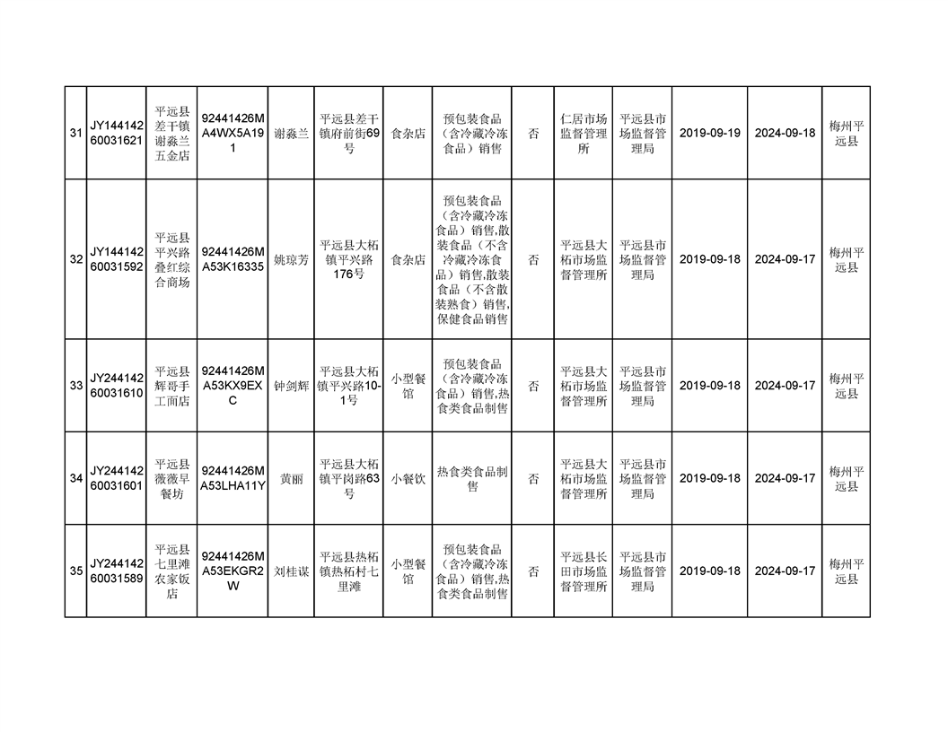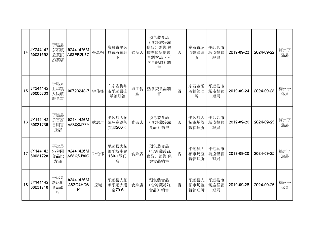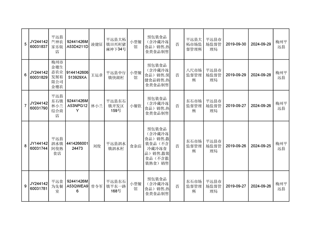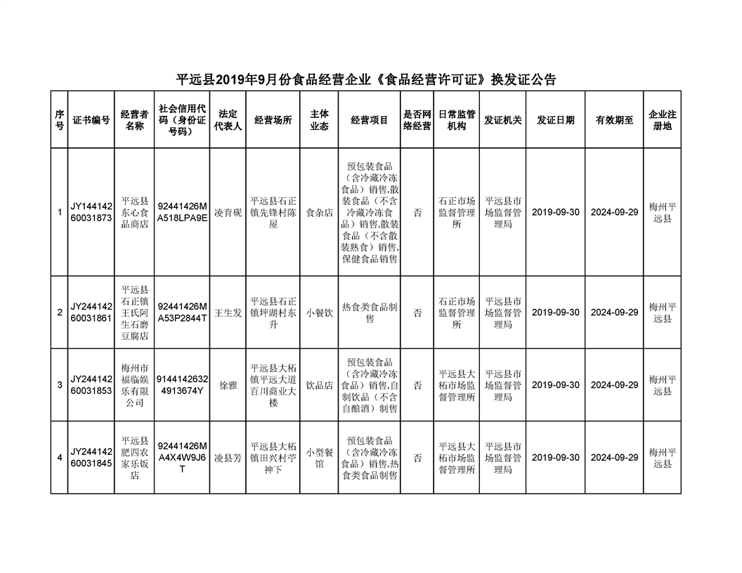 平遠縣2019年9月份食品經(jīng)營企業(yè)《食品經(jīng)營許可證》換發(fā)證公告