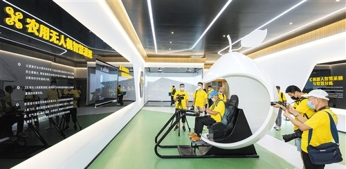 “中國柚子看梅州”采風(fēng)體驗(yàn)團(tuán)一行在大埔縣蜜柚省級現(xiàn)代農(nóng)業(yè)產(chǎn)業(yè)園體驗(yàn)農(nóng)用無人機(jī)智慧灌溉。(圖片來源:梅州日報(bào) 連志城 攝)