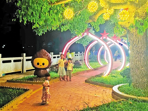 夜幕降臨,五華縣雙華鎮(zhèn)政府門口的小公園燈光璀璨,漫步其間的小道,特色打卡點、可愛的板栗娃娃造型讓人不禁駐足拍照……