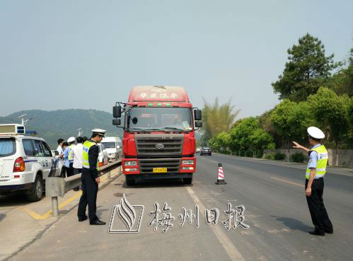 相關(guān)部門設(shè)卡對(duì)過往貨車進(jìn)行檢查。(圖片來源:梅州日?qǐng)?bào),李盛華 攝)