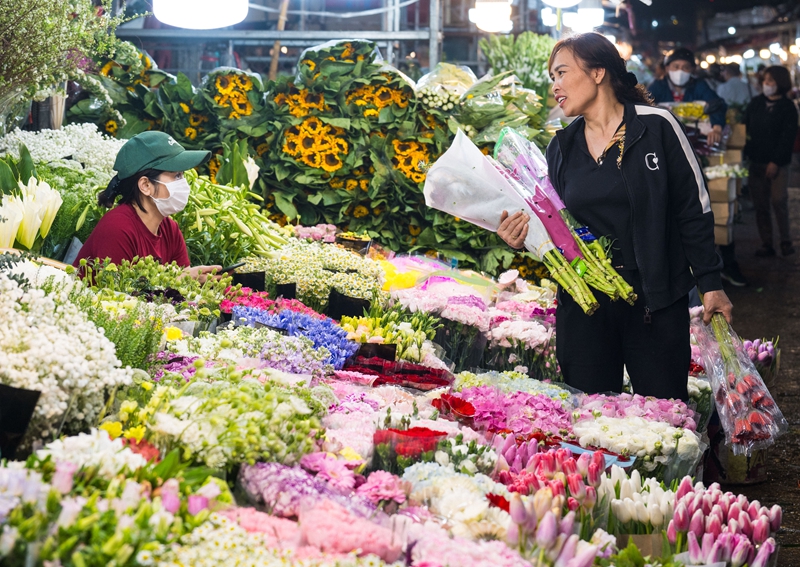 2025年3月28日,一名女子在越南河內廣霸花市購買鮮花。新華社記者 朱煒 攝