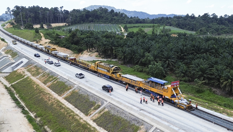 這是2024年5月6日在馬來西亞彭亨州航拍的馬東鐵項目的鋪軌現(xiàn)場。新華社記者 程一恒 攝