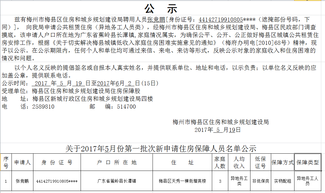 關(guān)于2017年5月份第一批次新申請(qǐng)住房保障人員名單公示