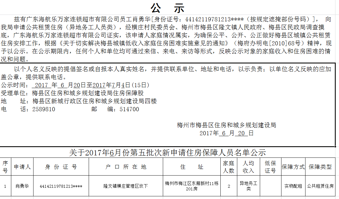 關(guān)于2017年6月份第五批次新申請住房保障人員名單公示