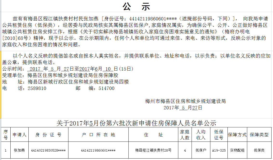 關(guān)于2017年5月份第六批次新申請住房保障人員名單公示