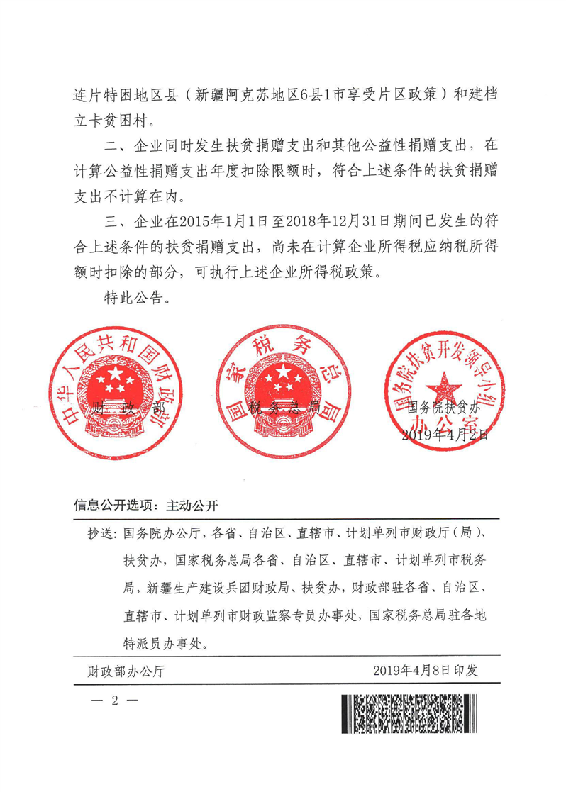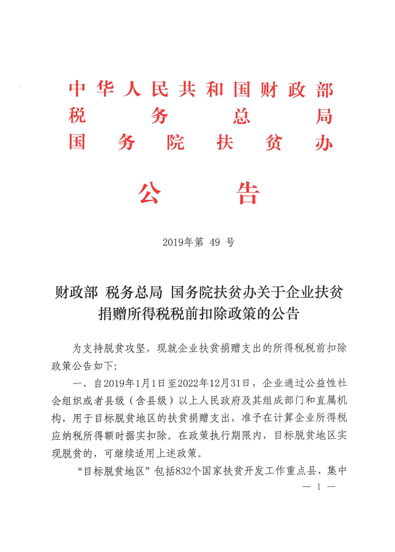 財政部 稅務總局 國務院扶貧辦關于企業(yè)扶貧捐贈所得稅稅前扣除政策的公告