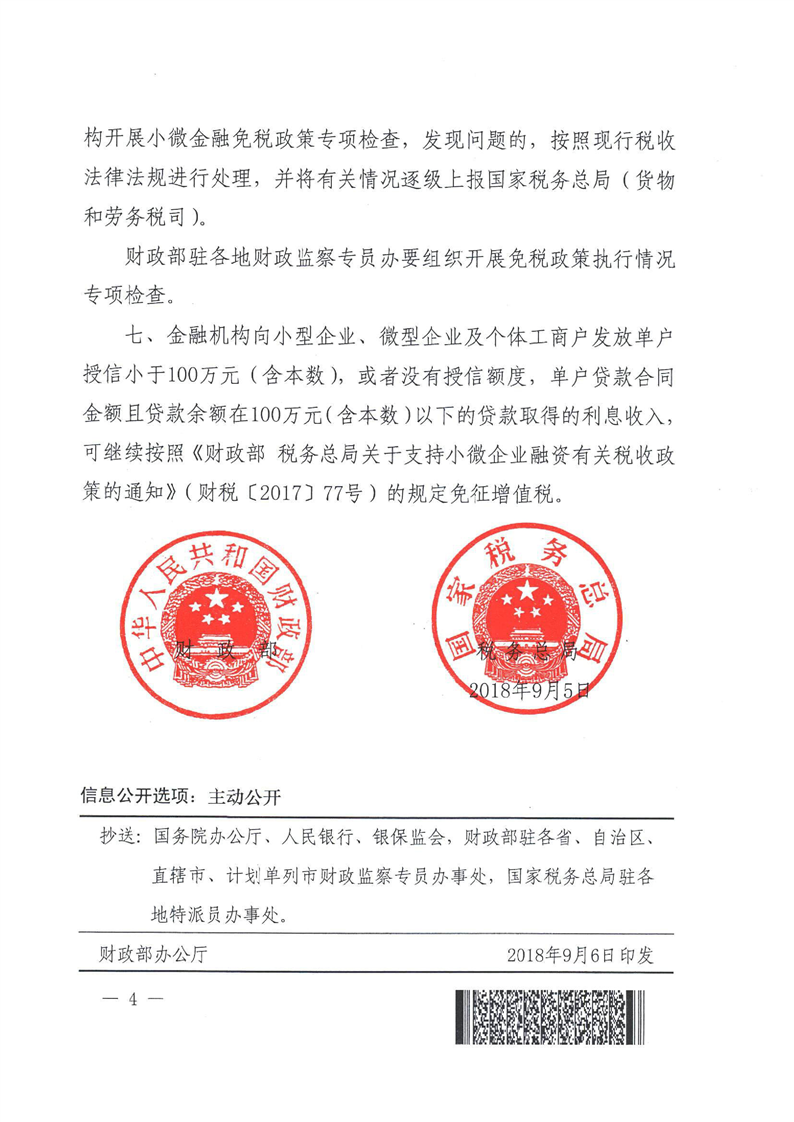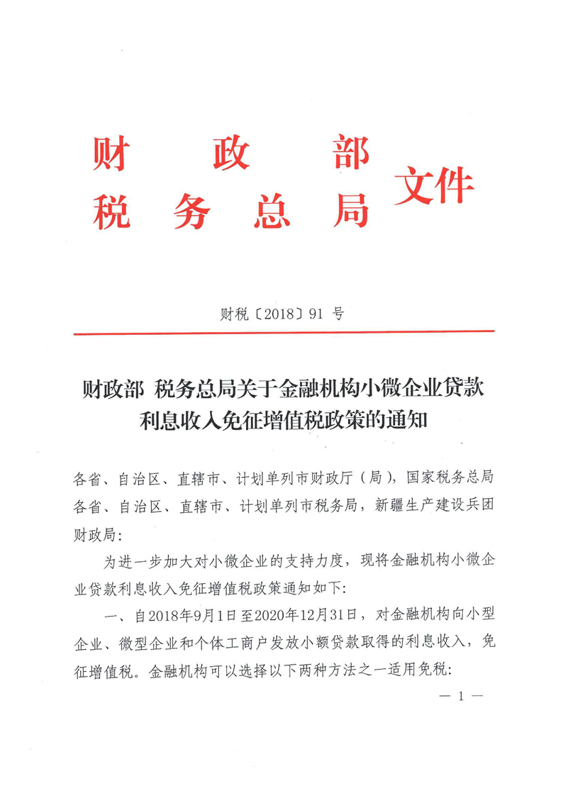 財(cái)政部 稅務(wù)總局關(guān)于金融機(jī)構(gòu)小微企業(yè)貸款利息收入免征增值稅政策的通知