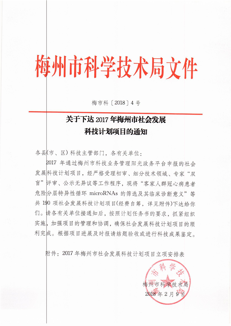 關(guān)于下達(dá)2017年梅州市社會發(fā)展科技計劃項目的通知
