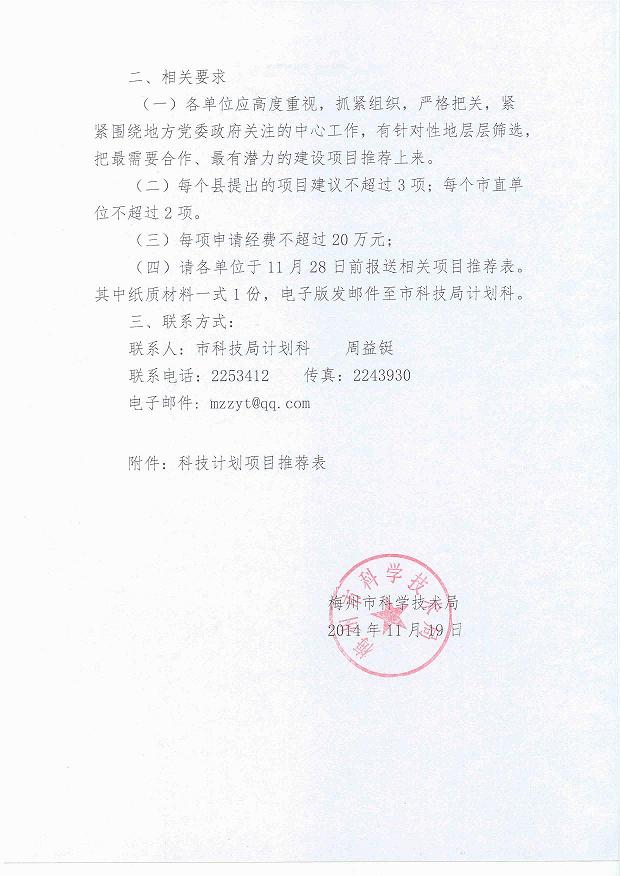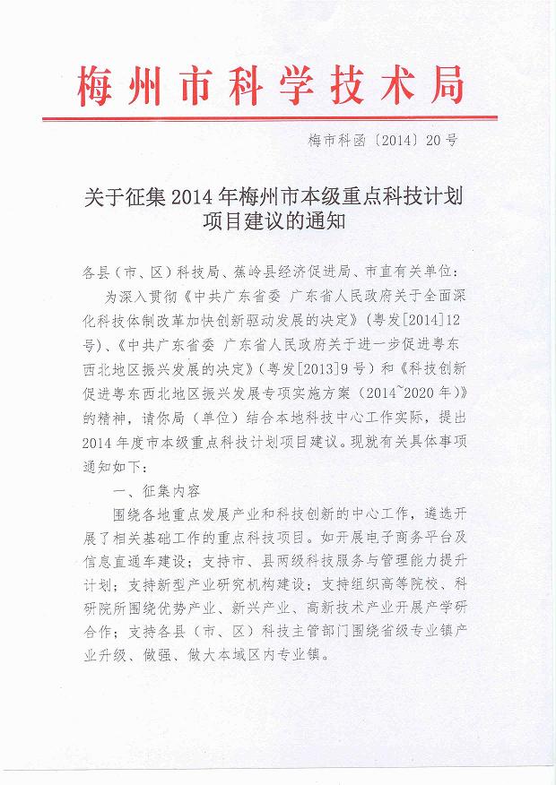 關(guān)于征集2014年梅州市本級(jí)重點(diǎn)科技計(jì)劃項(xiàng)目建議的通知