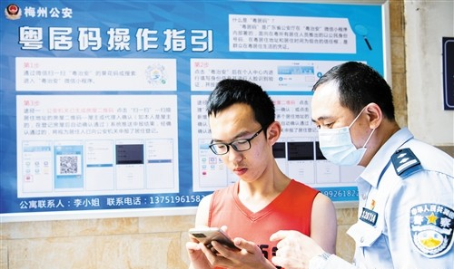民警指引居民通過“粵居碼”登記有關(guān)信息。(圖片來源:梅州日?qǐng)?bào) 何志林 攝)