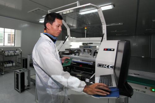 ▲隨著改革的深入,我市企業(yè)的自主創(chuàng)新意識不斷提高。圖為去年落戶平遠(yuǎn)的北斗星航公司技術(shù)人員正在SMT生產(chǎn)線上工作。