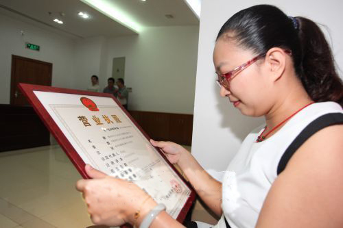 ▲我市加快推進(jìn)工商登記注冊便利化改革。圖為某企業(yè)負(fù)責(zé)人領(lǐng)到了我市首張“三證合一”營業(yè)執(zhí)照。