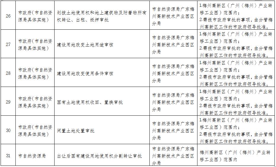 《梅州市政府相關(guān)職能部門委托梅州高新區(qū)(廣梅產(chǎn)業(yè)轉(zhuǎn)移園)管委會(huì)行使部分行政管理職權(quán)事項(xiàng)目錄》(修訂)已經(jīng)市人民政府同意,現(xiàn)印發(fā)給你們。本目錄從印發(fā)之日起執(zhí)行,此前發(fā)布的有關(guān)規(guī)定與本目錄規(guī)定不一致的,以本目錄為準(zhǔn)。執(zhí)行過程中,遇到的問題,請(qǐng)徑向原實(shí)施單位反映。