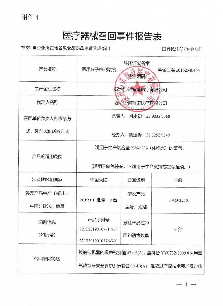 深圳心諾智造醫(yī)療有限公司報(bào)告,該公司對(duì)其生產(chǎn)的醫(yī)用分子篩制氧機(jī)實(shí)施主動(dòng)召回處理,召回級(jí)別為三級(jí),涉及產(chǎn)品的型號(hào)、規(guī)格及批次等詳細(xì)信息見《醫(yī)療器械召回事件報(bào)告表》。