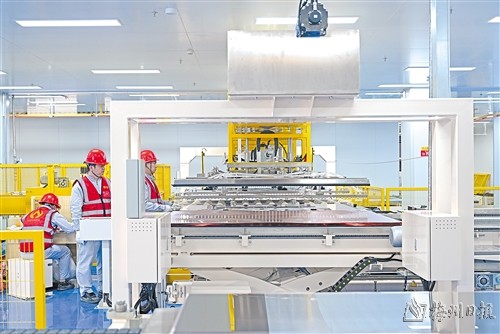 廣東盈華電子材料有限公司年產(chǎn)3600萬(wàn)張高性能覆銅板建設(shè)項(xiàng)目二期首條生產(chǎn)線正式投產(chǎn)。(袁志鵬 攝)