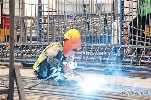 工人正在進(jìn)行鋼筋焊接作業(yè)。(汕梅高速公路改擴(kuò)建項(xiàng)目部供圖)