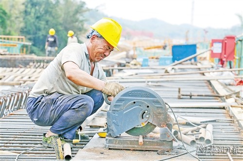 工人在瑞梅鐵路平遠段施工現(xiàn)場作業(yè)。(高訊 攝)