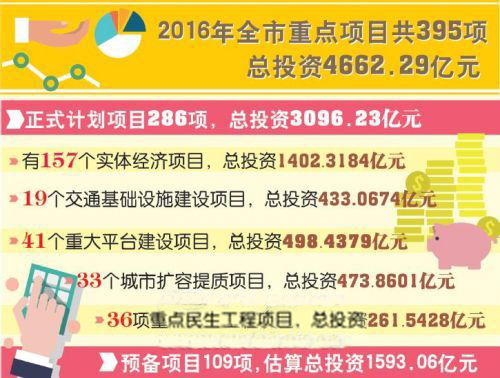 在“十三五”規(guī)劃的開局之年,我市印發(fā)了2016年重點項目工作目標責(zé)任制實施方案,確保實現(xiàn)項目年度投資計劃100%完成的工作目標。在全市395個重點項目中,正式計劃項目286項,總投資3096.23億元,年度投資計劃605.43億元;預(yù)備項目109項,估算總投資1593.06億元。